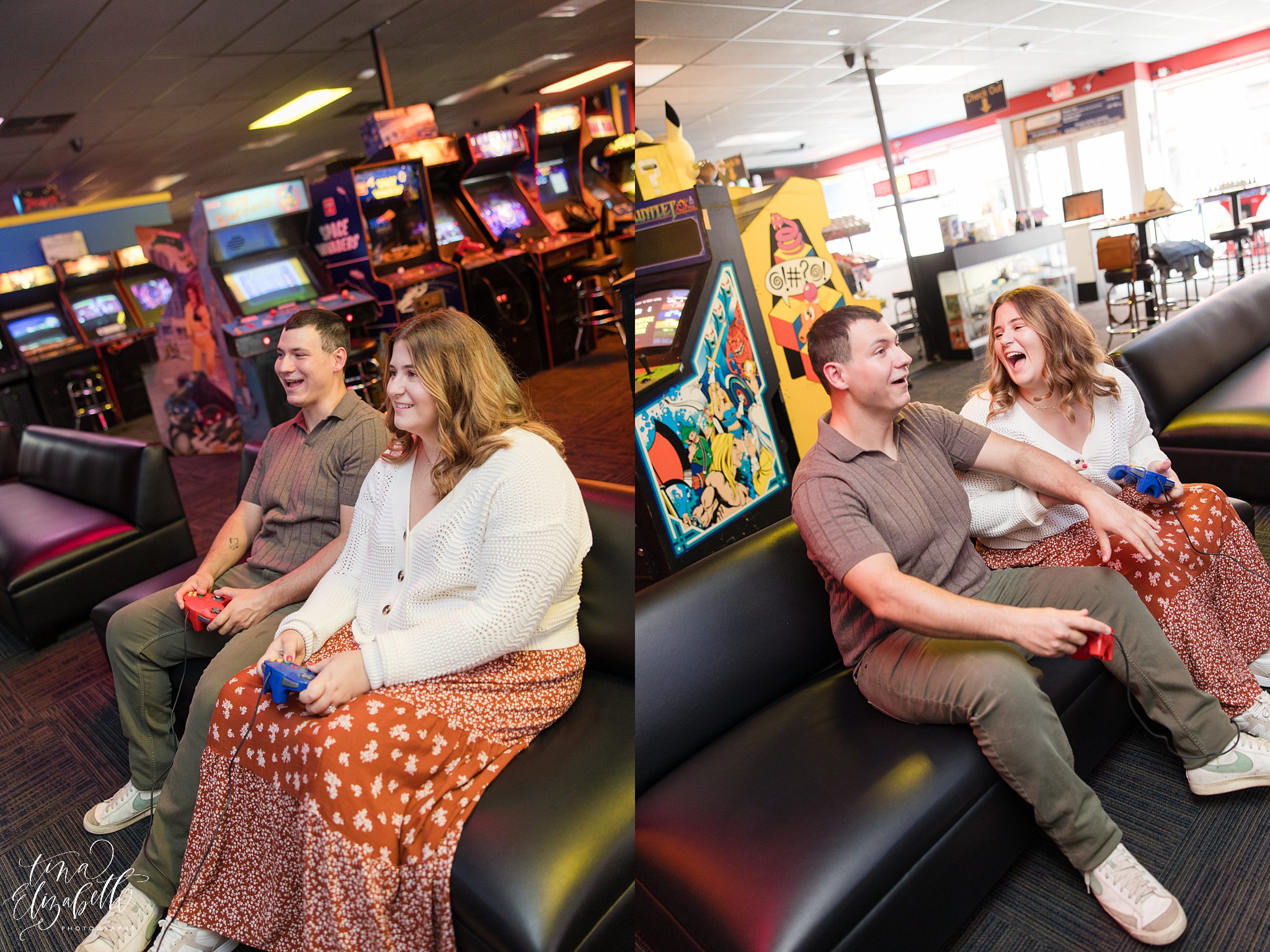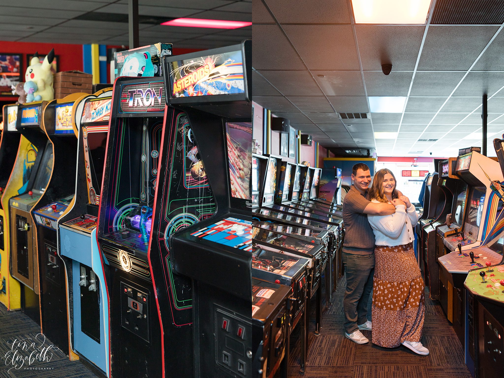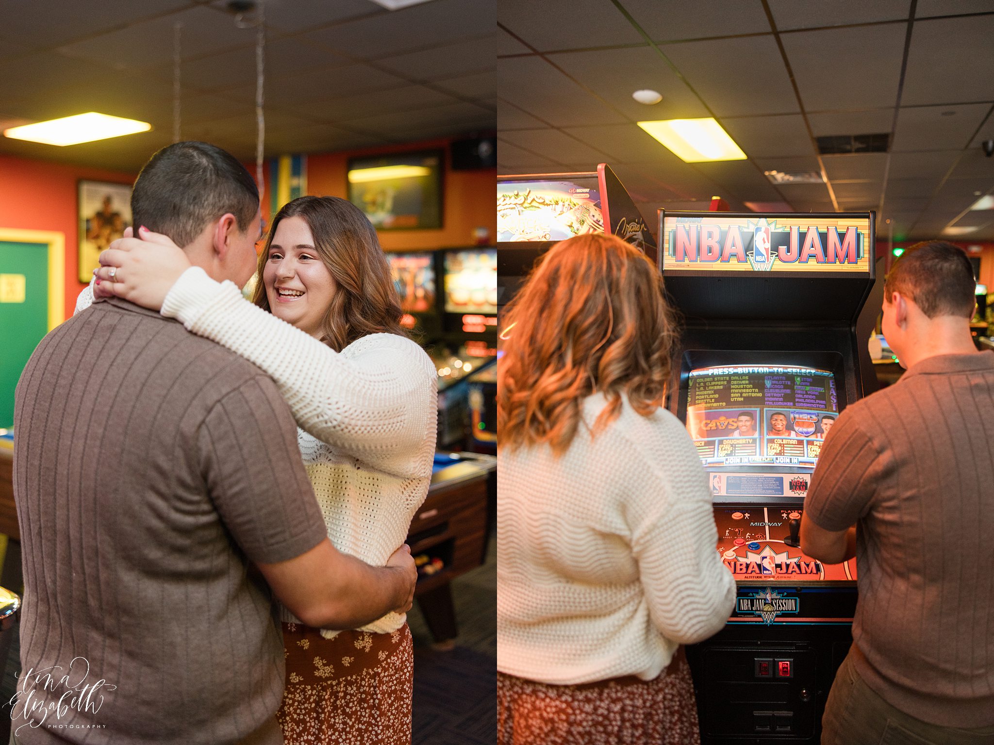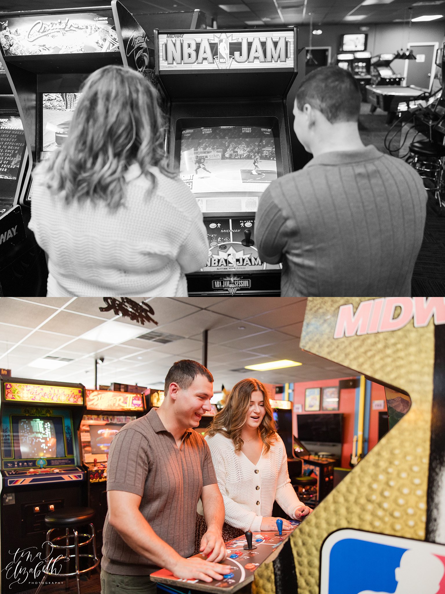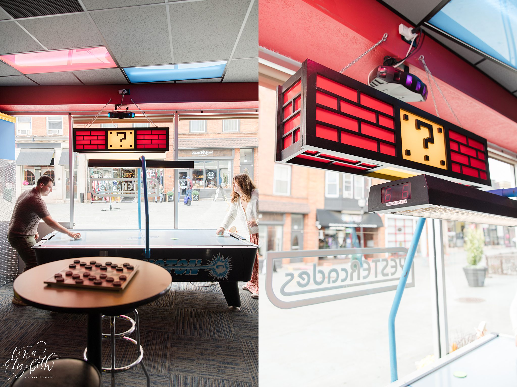 There’s nothing I love more than when we go back to where it all started for my couples at their engagement sessions. Brianna and Michael’s started with laughter, friendly competition, and a few rounds of NBA Jam at Yestercades in downtown Somerville. It’s where they had their very first date, and where they’ve spent countless nights since — playing old-school arcade games and just enjoying being together. Inside Yestercades, they were totally in their element — laughing over pinball scores, playfully challenging each other at air hockey, and reminiscing about their first night there. You could see how comfortable and connected they are — that easy kind of love that comes from years of shared memories and genuine friendship.