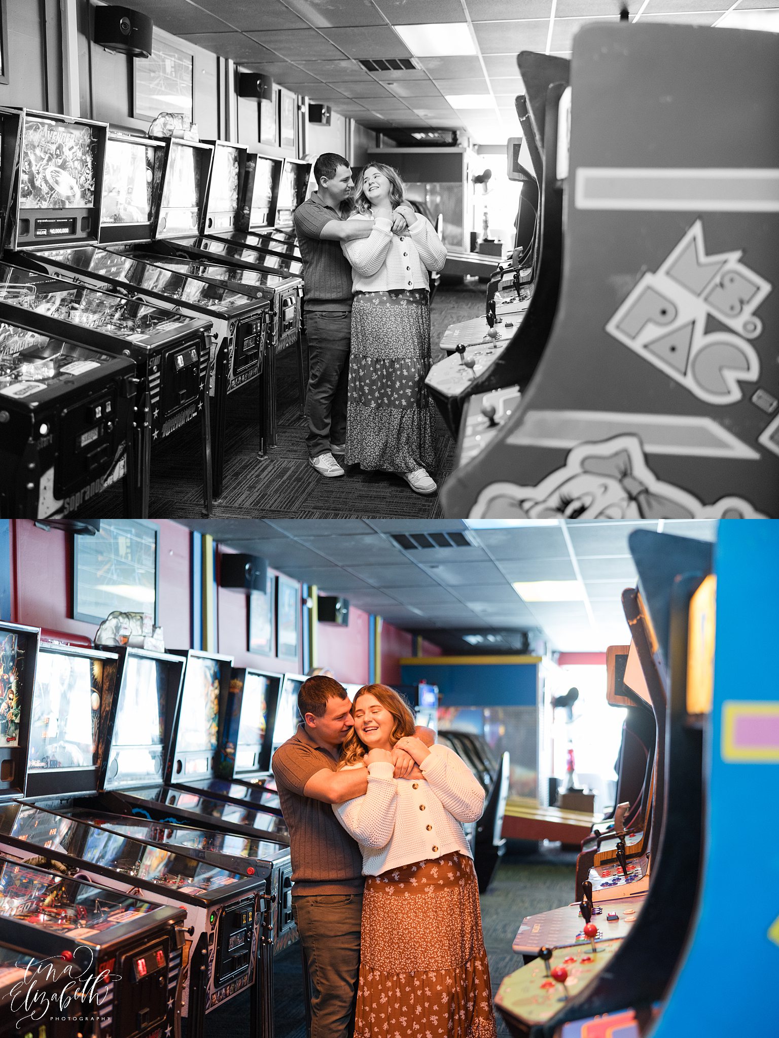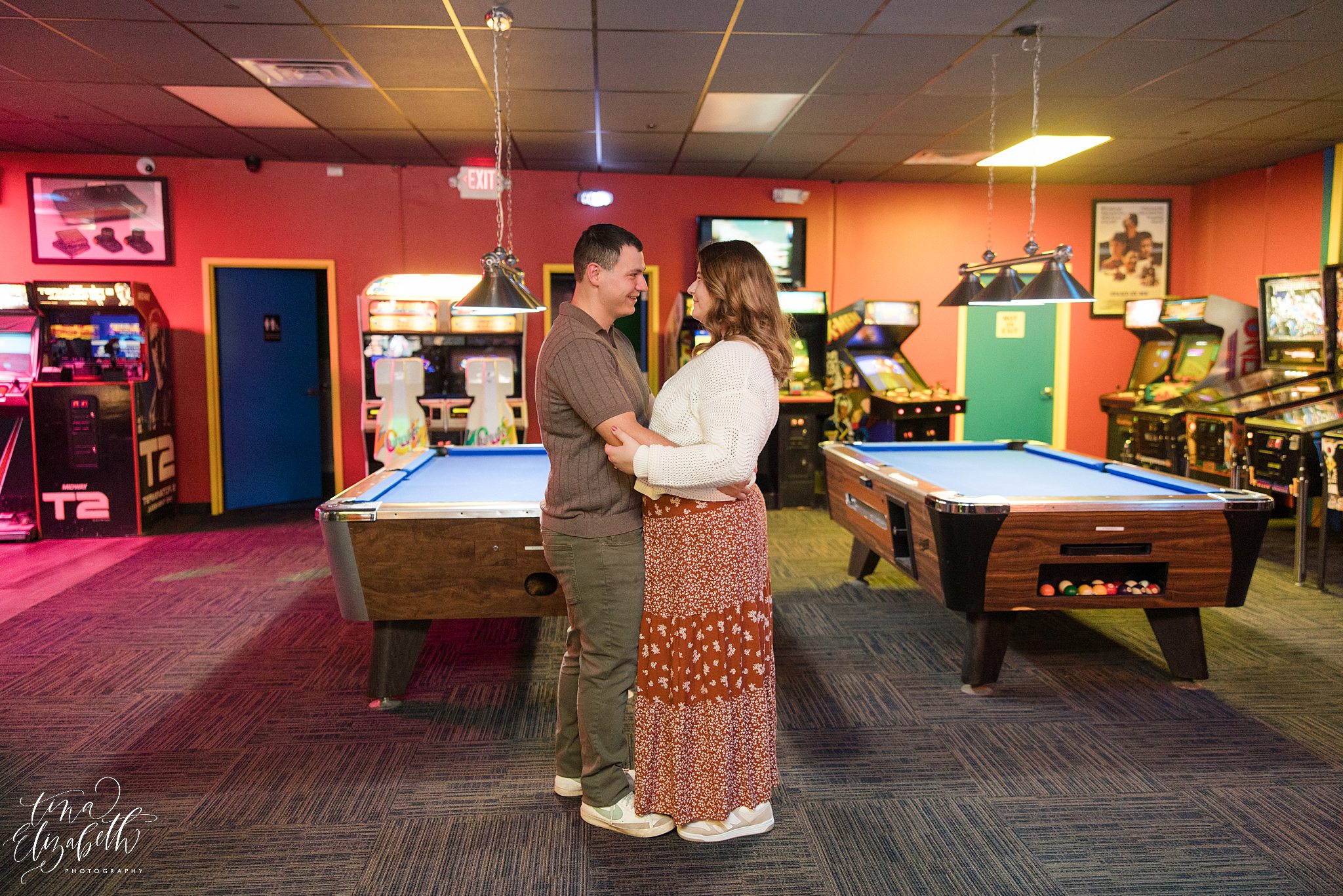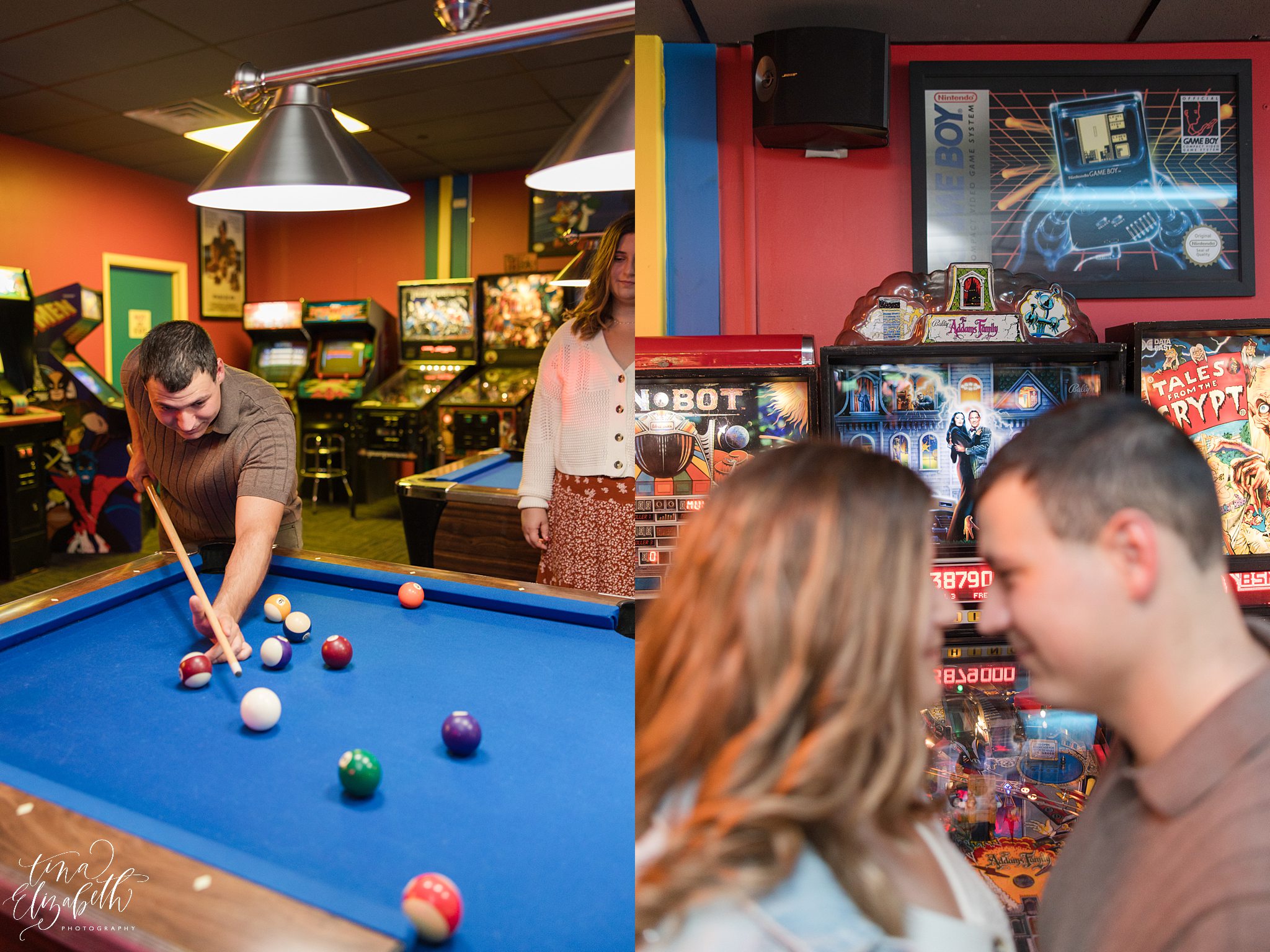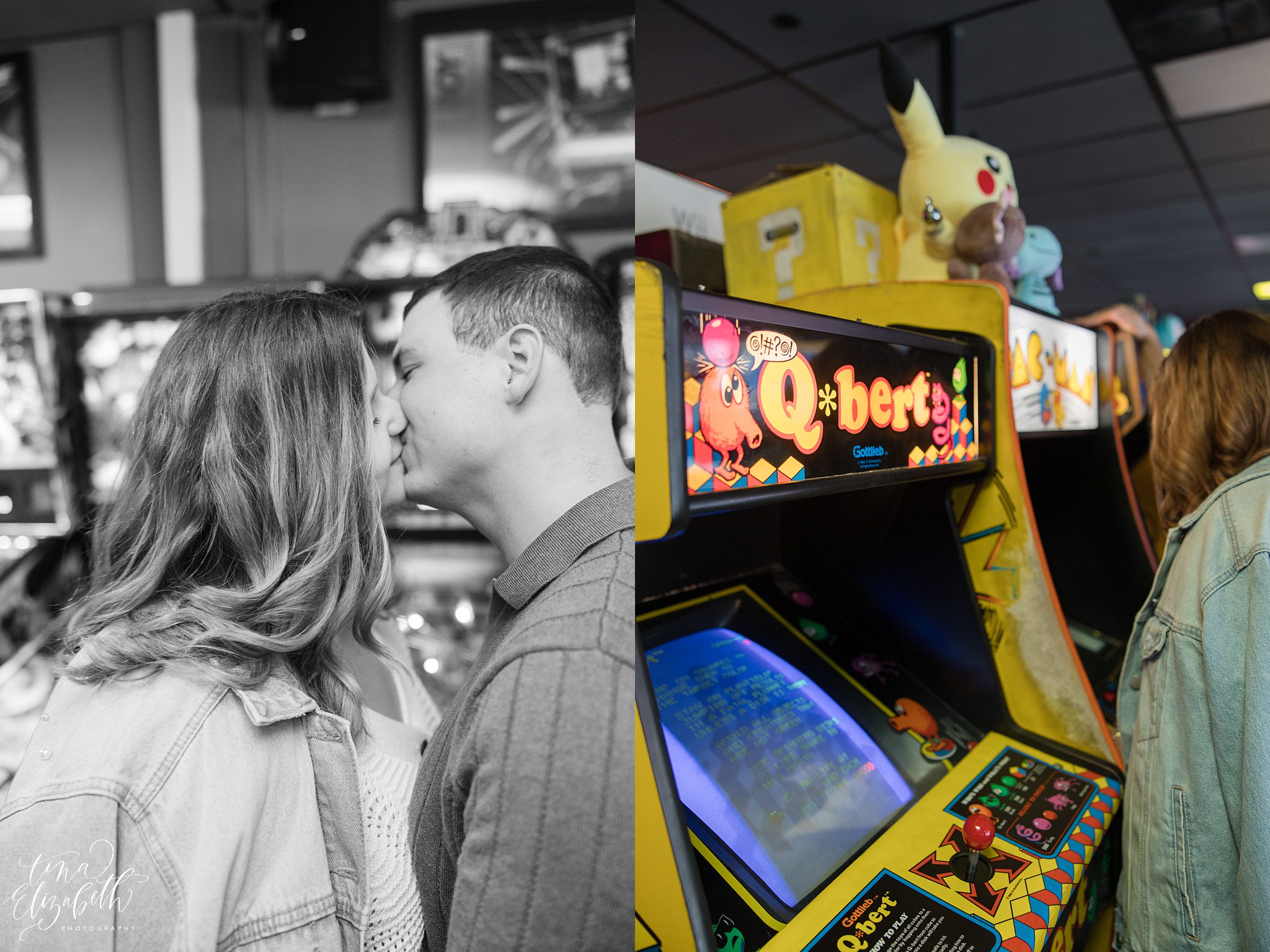 There’s nothing I love more than when we go back to where it all started for my couples at their engagement sessions. Brianna and Michael’s started with laughter, friendly competition, and a few rounds of NBA Jam at Yestercades in downtown Somerville. It’s where they had their very first date, and where they’ve spent countless nights since — playing old-school arcade games and just enjoying being together. Inside Yestercades, they were totally in their element — laughing over pinball scores, playfully challenging each other at air hockey, and reminiscing about their first night there. You could see how comfortable and connected they are — that easy kind of love that comes from years of shared memories and genuine friendship.