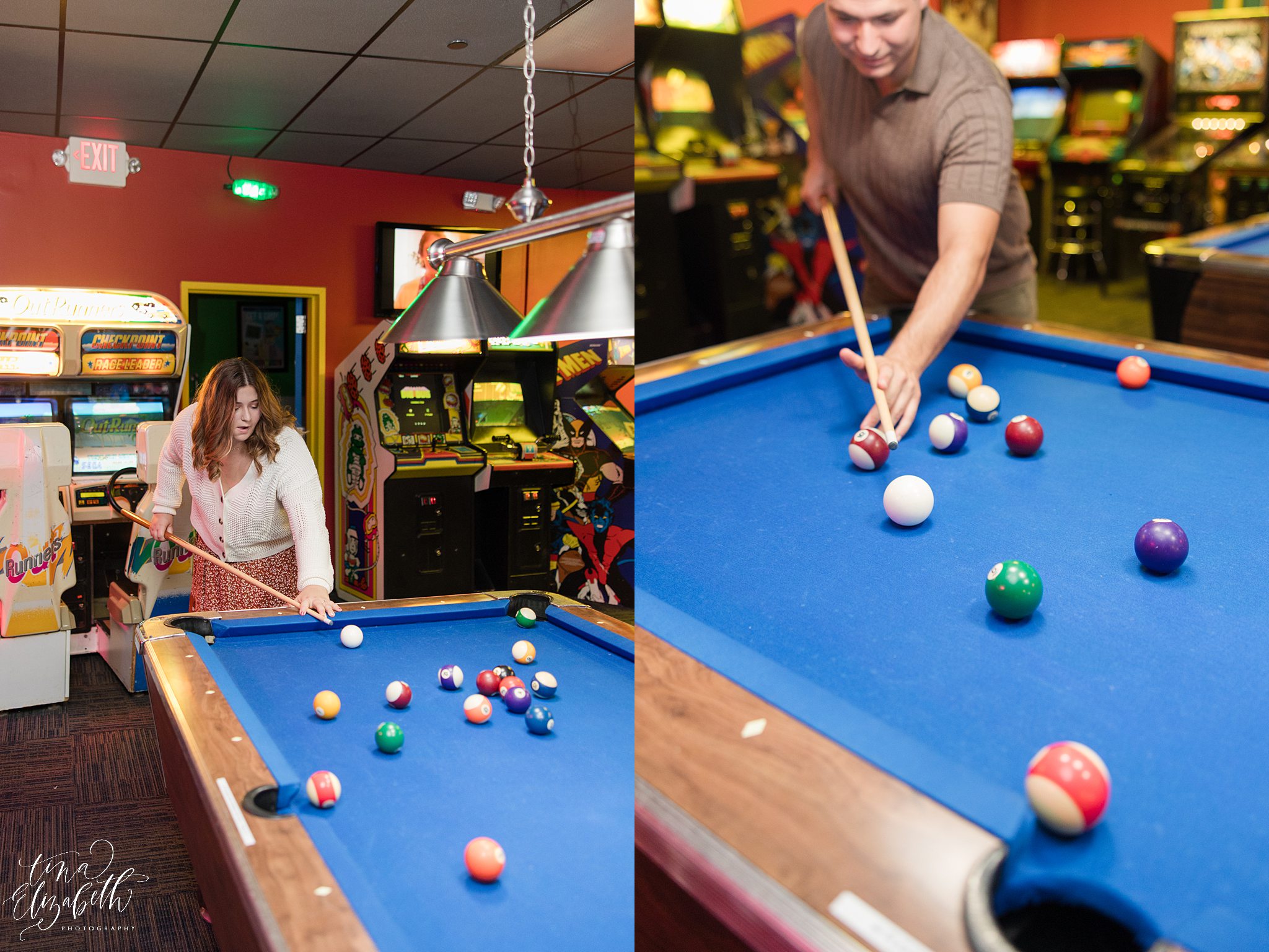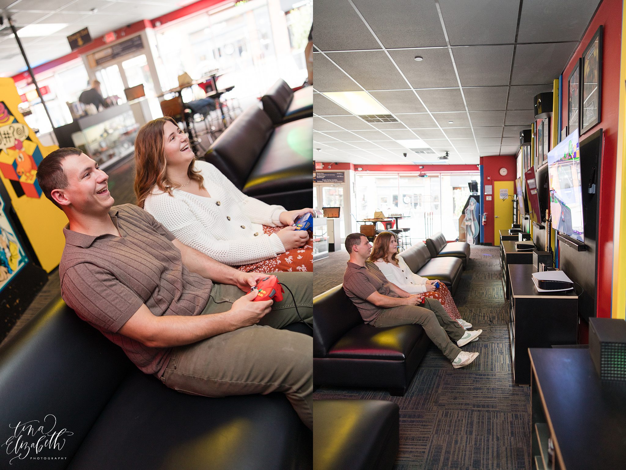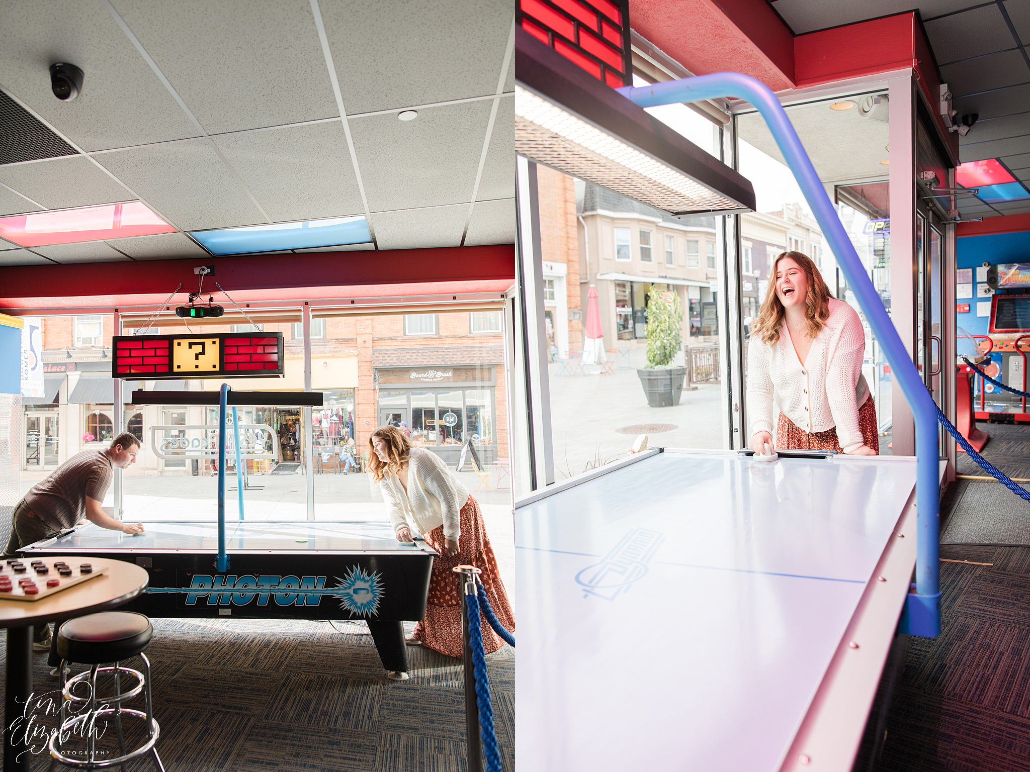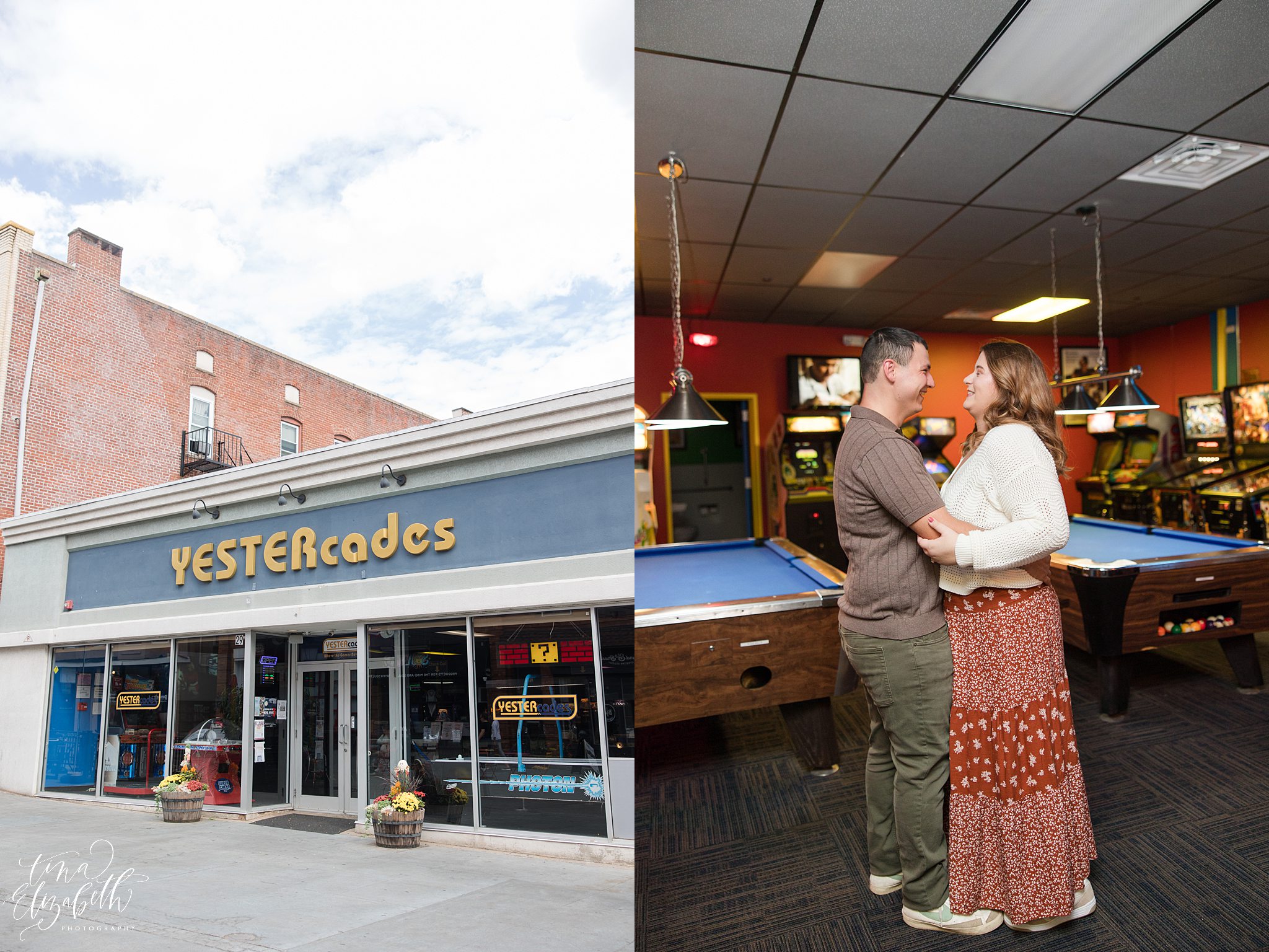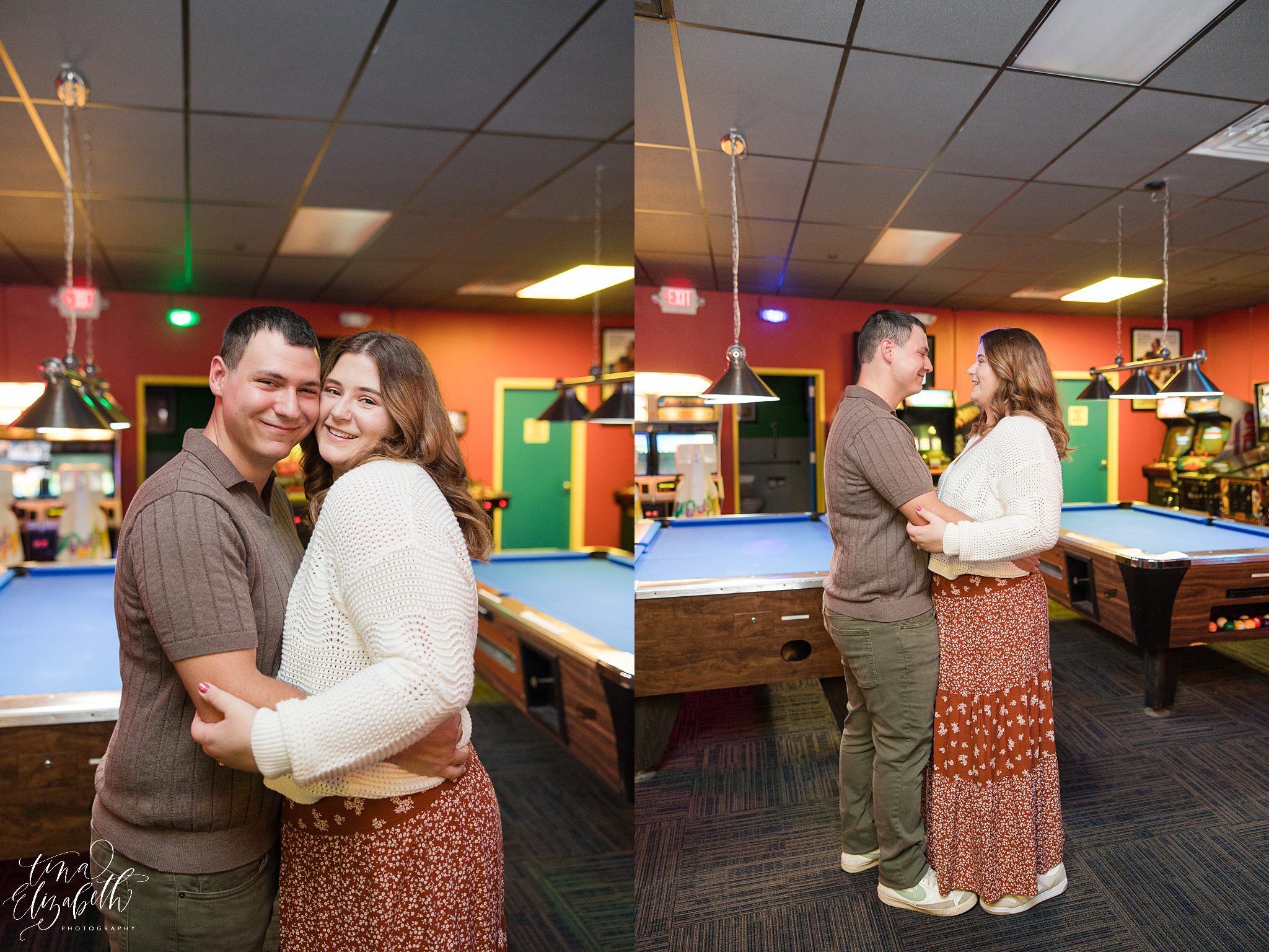 There’s nothing I love more than when we go back to where it all started for my couples at their engagement sessions. Brianna and Michael’s started with laughter, friendly competition, and a few rounds of NBA Jam at Yestercades in downtown Somerville. It’s where they had their very first date, and where they’ve spent countless nights since — playing old-school arcade games and just enjoying being together. Inside Yestercades, they were totally in their element — laughing over pinball scores, playfully challenging each other at air hockey, and reminiscing about their first night there. You could see how comfortable and connected they are — that easy kind of love that comes from years of shared memories and genuine friendship.